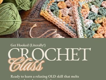 For a Beginner Crochet Class where you’ll learn foundational stitches, how to read simple patterns, and start creating with confidence. No experience needed, just bring yourself and enjoy a calming, hands on evening.